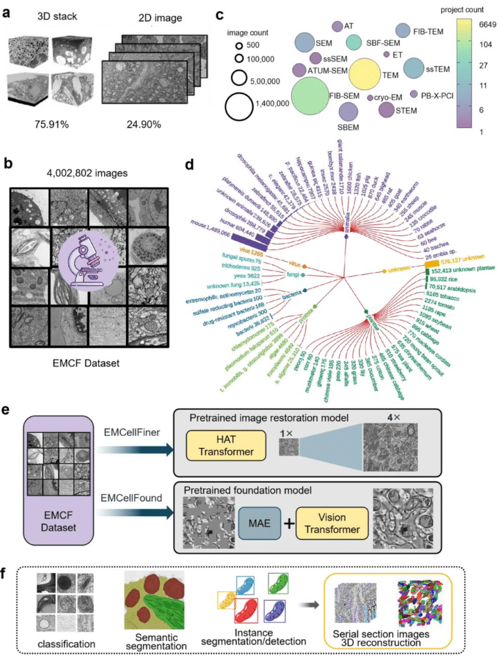EMCF ecosystem: Towards pretrained foundation model for electron microscopy image analysis
