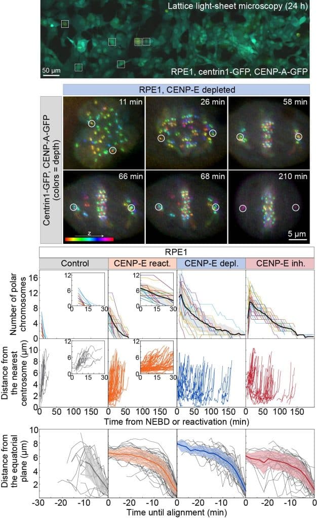 Figure 1. Lattice light-sheet microscopy of chromosome alignment dynamics following CENP-E perturbation. Lattice light-sheet microscopy (LLSM) field of view showing RPE-1 cells expressing centrin1-GFP and CENP-A-GFP, colour-coded by depth. Cells were treated with 80 nM CENP-E inhibitor (GSK-923295) for 3 h prior to imaging; boxed regions indicate mitotic cells (top). Representative time-lapse images show an RPE-1 cell after CENP-E depletion (middle). All images are maximum-intensity projections; time 0 marks mitotic entry. Quantification shows the number of polar chromosomes (bottom, top), their distance to the nearest spindle pole (bottom, middle), and their distance from the equatorial plane until successful alignment (bottom, bottom) for the indicated treatments. Thick lines indicate means; shaded regions show standard deviation. - Which imaging techniques were essential for this work and why?