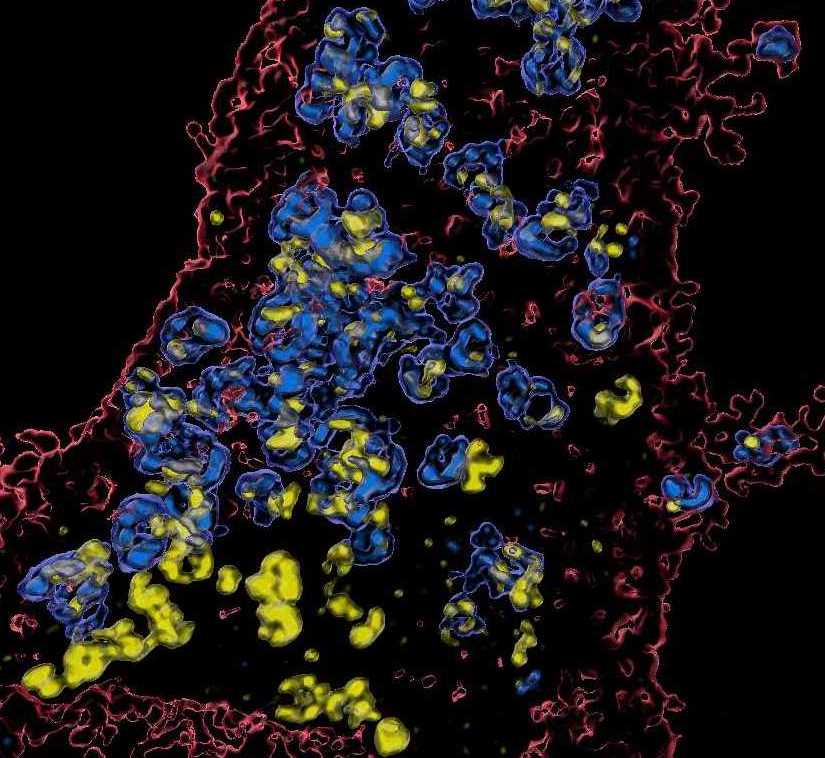 Autophagosomes (yellow) fusing with lysosomes (blue) in autophagy-induced HeLa cells