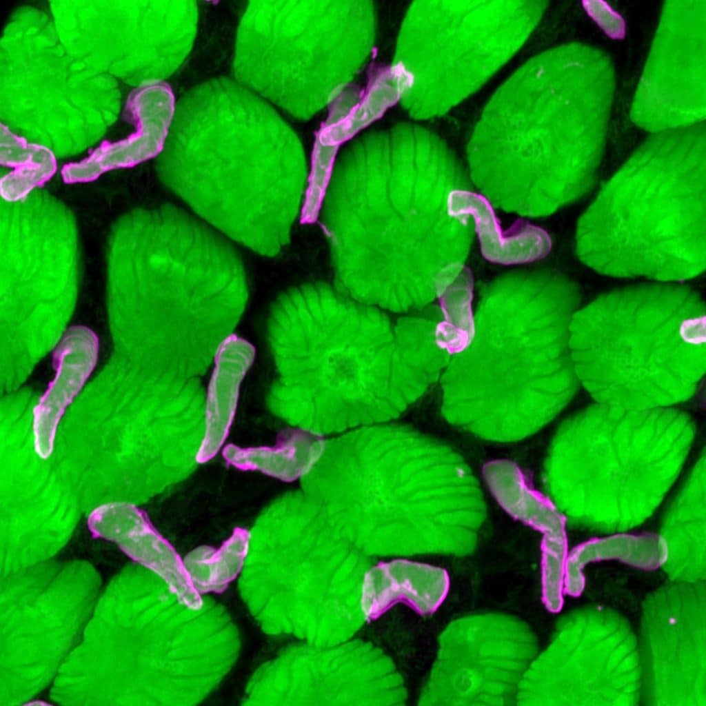 Our featured image, acquired by Brittany Carr, shows the rod and cone photoreceptor outer segments from a tadpole retina. Photoreceptor outer segments are responsible for capturing photons of light and transducing them into chemical signals. Frog rods are large, so this image also shows the incisures, which are invaginations into the outer segment that gives